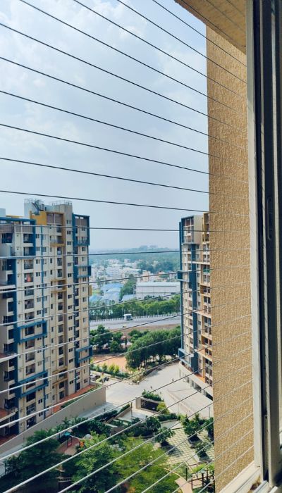 Secure your space with Dhakshayani Safety Nets Pigeon Safety Nets and stylish cloth hangers. Contact us for installation!